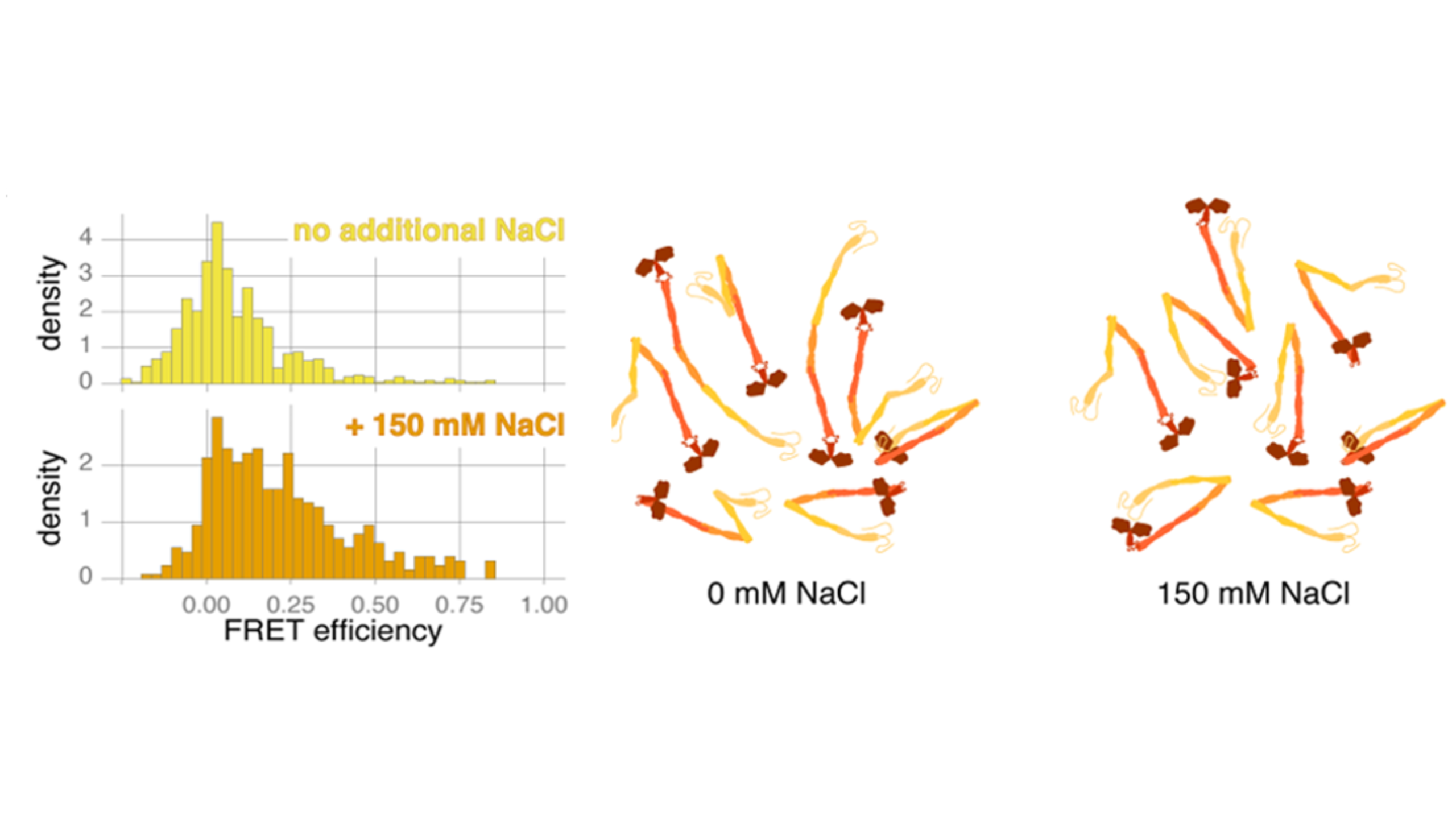 Smith et al. used smFRET to investigate the impact of salt on the structural conformation of Kinesin-1. At 0 nM NaCl, Kinesin-1 is thought to have a mixed population that is mostly formed of molecules in open conformations (low FRET efficiency). At 150 nM NaCl, a larger proportion of these molecules are in a closed, inactive state (high FRET efficiency), although both conditions show highly heterogeneous populations. If this were an ensemble assay, the FRET efficiency from multiple conformations would be averaged together, resulting in a single FRET value that would suggest the presence of a single conformation. smFRET allows you to see each kinesin-1 molecule and its conformational state, revealing the true heterogeneity of these molecules.