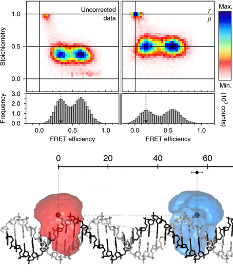 Accurate FRET correction (top) and accessible volume modelling (bottom) are used to ensure calculated distances relate to the physical position of dyes on labelled biomolecules.